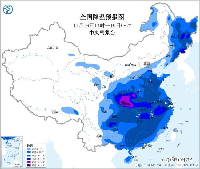 冬季的“大暖”背后,紧随着的基本都是“大冷”。16日,中央气象台继续发布寒潮和大风蓝色预警,预计11月16日至18日,寒潮将继续南下影响中东部地区,带来大范围大风降温天气。其中,未来48小时,西北地区东部、内蒙古东北部、华北中南部、东北地区中东部、黄淮、江汉、江淮、江南、华南北部等地气温下降6-10℃,部分地区降温幅度可达10-14℃,陕西东南部局地可超过14℃。