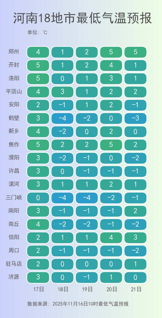 18日早晨,大部地区最低气温跌破冰点,西部山区零下8度到零下4度,局部甚至直逼零下10度,西部、南部部分地区将出现寒潮!此轮降温迅猛,河南“速冻模式”开启!提醒大家羽绒服、厚围巾安排上了,外出一定注意防寒保暖。