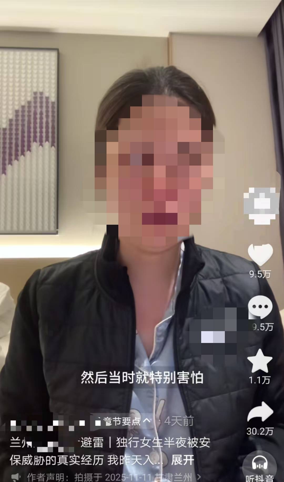 该女子称,当时是晚上,保安的这种行为让她非常害怕,于是就关了门,向前台投诉该保安,但并未解决。“这个保安的行为,不仅是服务问题,而是让所有像我这样的独行女性住客,产生恐惧的安全隐患。”她说。