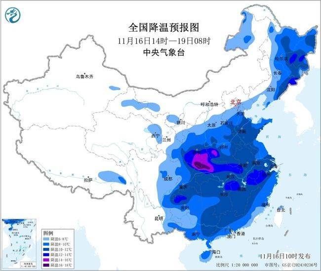 冬季的“大暖”背后,紧随着的基本都是“大冷”。16日,中央气象台继续发布寒潮和大风蓝色预警,预计11月16日至18日,寒潮将继续南下影响中东部地区,带来大范围大风降温天气。其中,未来48小时,西北地区东部、内蒙古东北部、华北中南部、东北地区中东部、黄淮、江汉、江淮、江南、华南北部等地气温下降6-10℃,部分地区降温幅度可达10-14℃,陕西东南部局地可超过14℃。