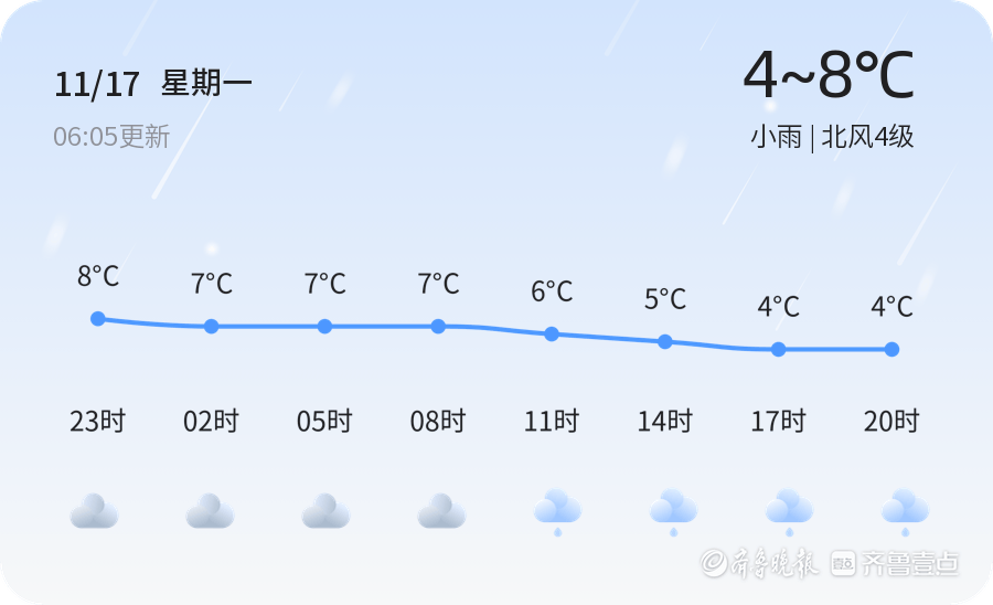 11月17日,星期一,农历九月廿八,威海市迎来小雨天气,当前温度5.2℃,北风4级,空气湿度44%,空气质量良好。寒潮蓝色预警已发布,提醒市民注意防范强风和低温。建议市民外出携带雨具,注意保暖和交通安全。未来三天,威海气温维持在4℃至8℃,伴有小雨和阴天。风力较大,沿海和内陆地区需防范强风影响。寒潮及时添衣,减少户外活动,尤其老人和孩子。驾车请注意减速,防范道路湿滑。未来一周,威海气温逐步回升,以多云和晴天为主,但仍有降温和降雨,提醒市民关注天气变化,适时添衣,合理安排出行。