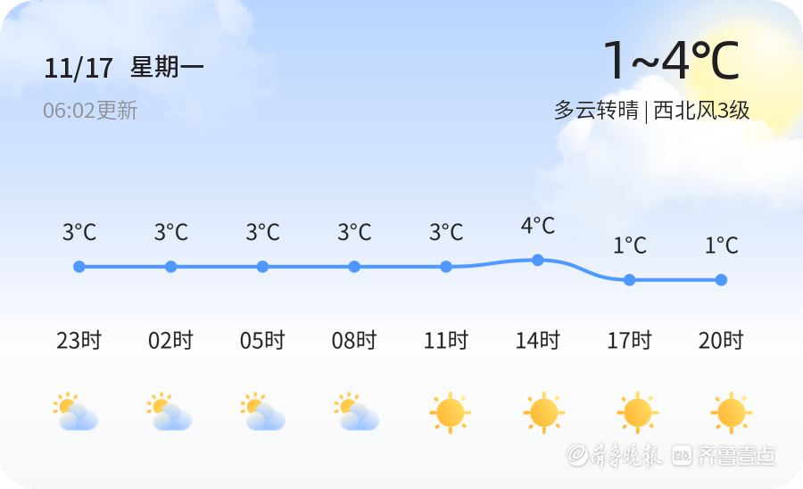 今天是2025年11月17日,农历九月廿八,星期一。东营市今日天气多云转晴,气温介于1℃至4℃之间,目前实时气温为2.3℃,西北风3级,空气湿度为39%,PM2.5浓度为23,空气质量等级为良好。今日天气较为寒冷,建议市民出行时注意保暖,尤其是早晚温差较大,需增添衣物以防感冒。此外,大风天气可能导致能见度较低,驾车时请保持安全车距,减速慢行。