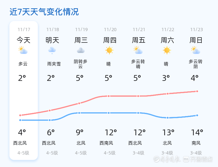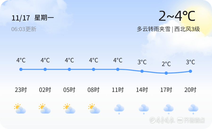 今天是11月17日,星期一,农历九月廿八。烟台市今天以多云转雨夹雪天气为主,气温在2℃到4℃之间,西北风3级,空气湿度45%,PM2.5指数为39,空气质量良好。各区天气情况基本一致,市民出行请注意携带雨具,防范雨雪天气带来的不便。