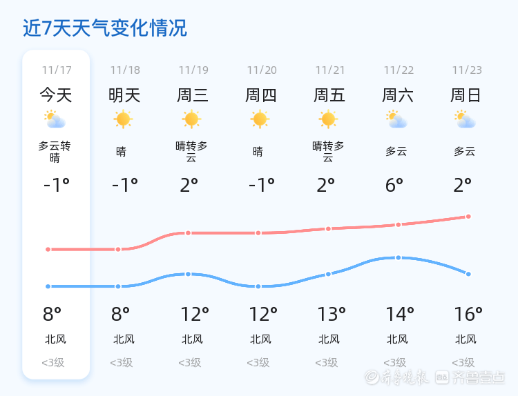 明天(11月18日),菏泽市天气将转为晴朗,气温与今日持平,仍为-1℃到8℃,北风风力减弱至<3级。相较于今日的阴转多云,明日天气更加晴朗,市民可抓住机会进行户外活动,享受冬日阳光。