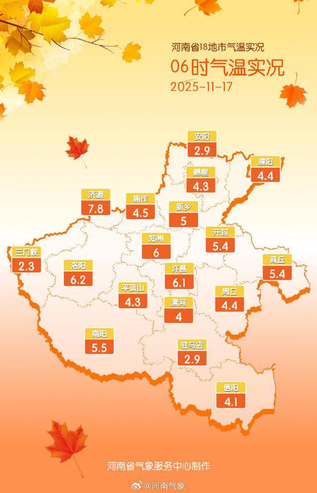 一夜之间,郑州的树叶褪去翠绿,满树金黄随风簌簌落下,铺满城市街道,踩上去沙沙作响。这场突如其来的 “黄叶铺街”,正是强寒潮席卷河南的直观体现:11月17日,河南降温进入核心时段,叠加持续大风引发的风寒效应,冷感比实际气温更强烈。