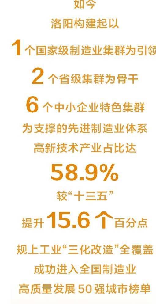 如今,洛阳构建起以1个国家级制造业集群为引领、2个省级集群为骨干、6个中小企业特色集群为支撑的先进制造业体系,高新技术产业占比达58.9%,较“十三五”提升15.6个百分点,规上工业“三化改造”全覆盖,成功进入全国制造业高质量发展50强城市榜单。