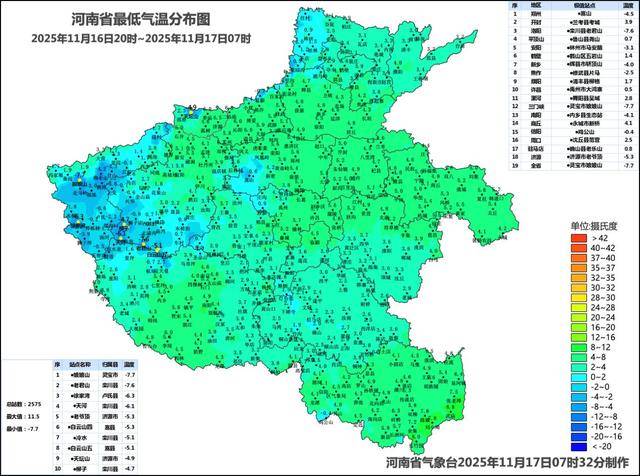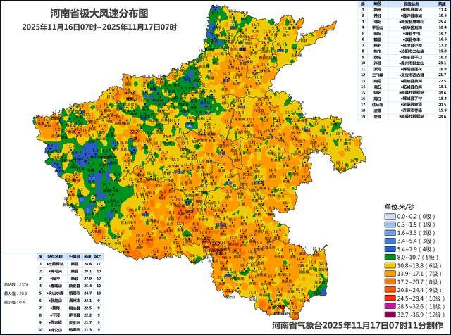 省气象台监测显示,11月16日7时至17日7时,我省黄河以南大部出现小雨雪,其中洛阳南部、南阳西部、驻马店西部、周口西部等地局部出现中雪,嵩山站出现暴雪。降水量位列前三的分别为:邓州市文渠26.5毫米、淅川县洞河22.9毫米、淅川县盛湾22.8毫米。降雪量位列前三的分别为:嵩山10.4毫米、泌阳4.4毫米、栾川3.5毫米。全省大部出现7到8级大风,局地9到11级。风速前三站分别为:新县杜鹃驿站28.6米/秒(11级)、新县黄毛尖28.1米/秒(10级)、新县陶冲27.9米/秒(10级)。此外,17日早晨,西部山区最低气温零下7℃到零下3℃,其他县(市、区)2到5℃,较前期明显下降。