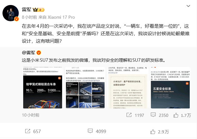 11月16日,雷军在微博发文:在去年4月的一次采访中,自己在谈产品定义时说,“一辆车,好看是第一位的”,这和“安全是基础、安全是前提”矛盾吗?还质疑:“还是在这次采访,我谈设计时候说轮毂最难设计,这有啥问题?”