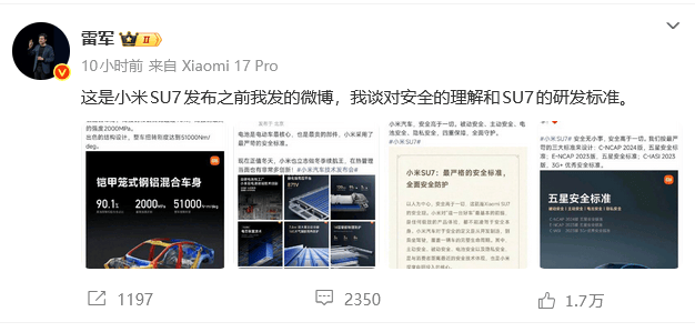 雷军援引了自己在2024年1月3日发布的微博,表达对汽车安全性的重视:“小米汽车,安全高于一切。被动安全、主动安全、电池安全、隐私安全,四重保障,全面守护。”还有在2023年12月发的微博:“电池是电动车最核心,也是最贵的部件,小米采用了最严苛的安全标准。”