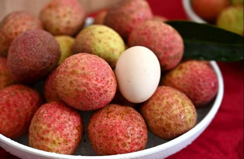 华南农业大学荔枝科技团队选育的荔枝新品种“仙桃荔”与鸡蛋对比。