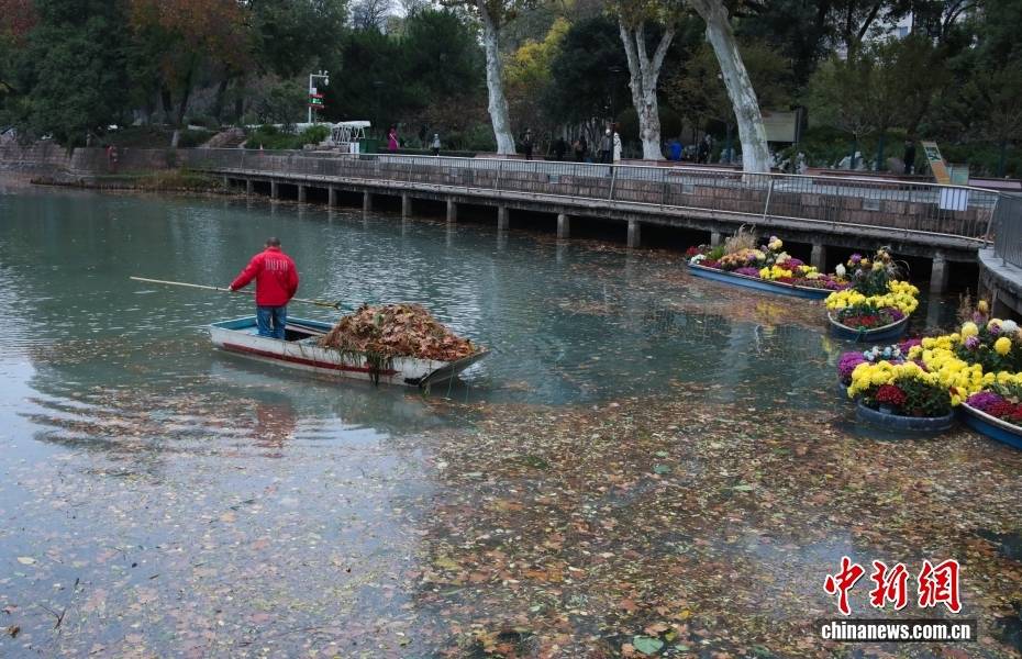 11月17日,受寒潮影响,湖北武汉遭遇大风降温天气。图为在武汉中山公园,工作人员打捞水面上的落叶。中新社记者 张畅 摄