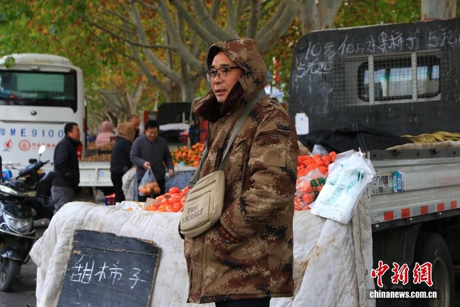 11月17日,受寒潮影响,河南迎降温天气。此轮降温迅猛,全省大部地区最高气温仅达个位数,多地市民纷纷穿着冬装出行。图为三门峡商户穿冬装卖柿子。中新社发 王建栋 摄