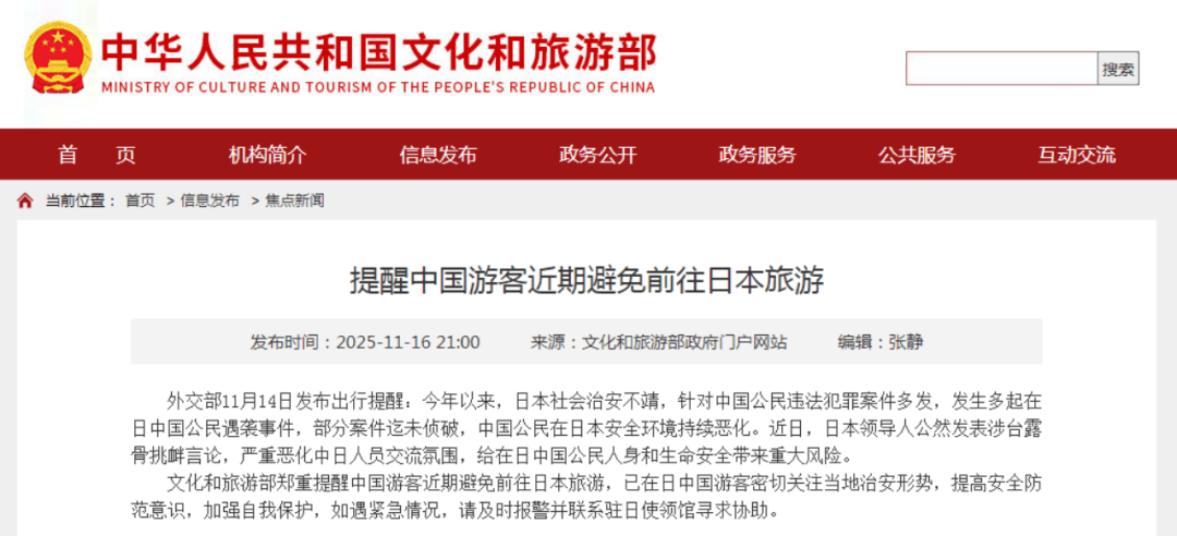 文化和旅游部郑重提醒中国游客近期避免前往日本旅游,已在日中国游客密切关注当地治安形势,提高安全防范意识,加强自我保护,如遇紧急情况,请及时报警并联系驻日使领馆寻求协助。