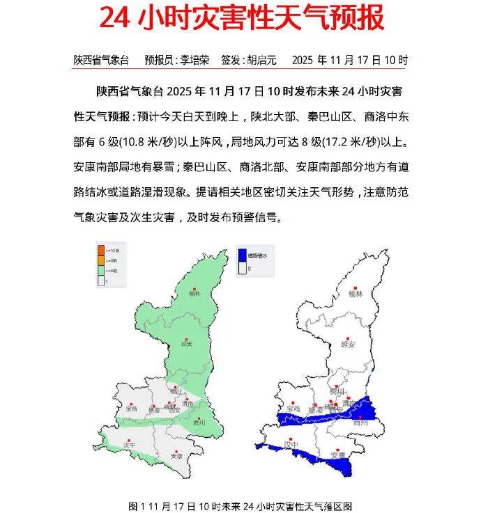 预计今天白天到晚上,陕北大部、秦巴山区、商洛中东部有6级(10.8米/秒)以上阵风,局地风力可达8级(17.2米/秒)以上。安康南部局地有暴雪;秦巴山区、商洛北部、安康南部部分地方有道路结冰或道路湿滑现象。提请相关地区密切关注天气形势,注意防范气象灾害及次生灾害,及时发布预警信号。