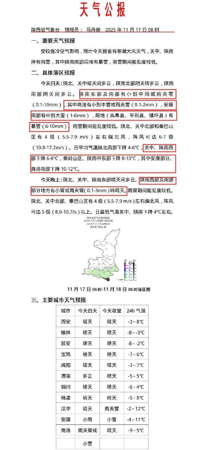 受较强冷空气影响,预计今天我省有寒潮大风天气,关中、陕南伴有雨雪,其中陕南南部局地有暴雪,雨雪期间能见度较低。
