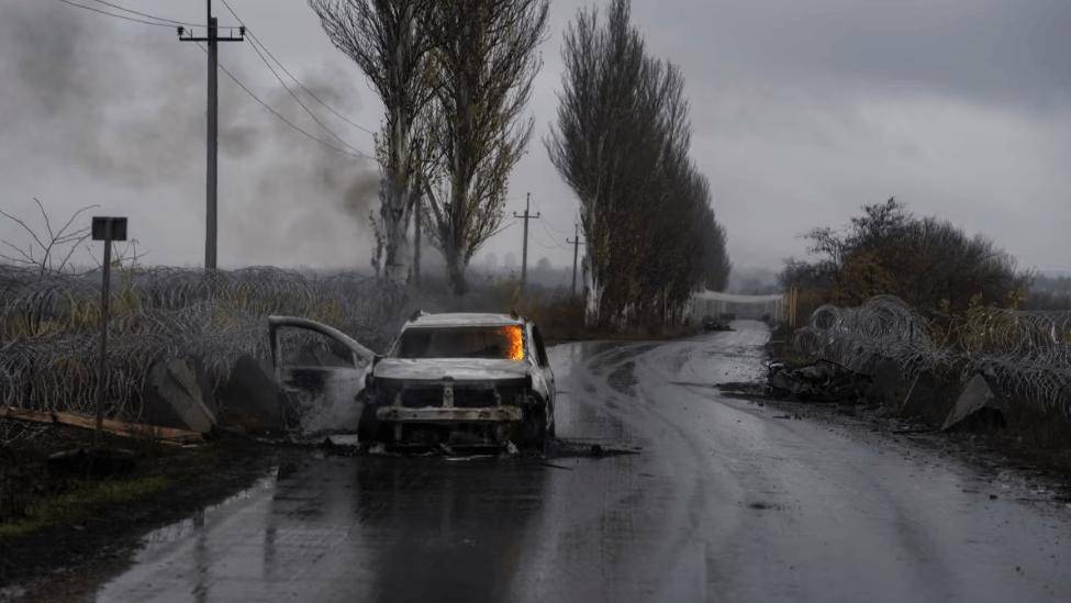 2025年11月12日,在乌克兰顿涅茨克地区的科斯蒂安蒂尼夫卡前线城镇,一辆汽车遭到俄罗斯无人机袭击后燃烧。