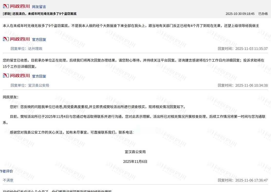 近日,四川达州一网友反映,其在未成年时无缘无故多了9个盗窃案底,“不是我做的,经大数据查下来全部在我头上,还我清白。”其跟当地有关部门反映4个月了无果,希望解决。