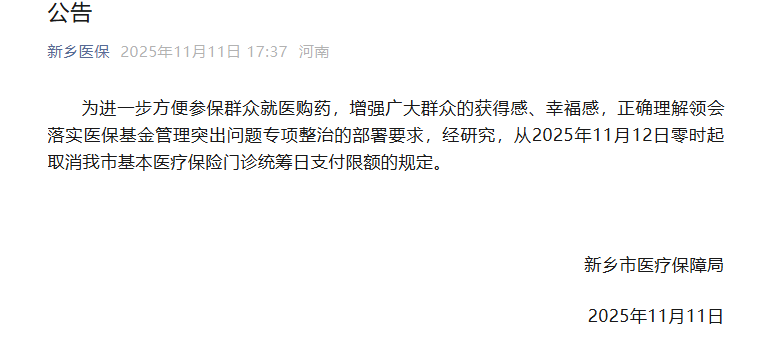 11月11日,新乡市医疗保障局发布公告:为进一步方便参保群众就医购药,增强广大群众的获得感、幸福感,正确理解领会落实医保基金管理突出问题专项整治的部署要求,经研究,从2025年11月12日零时起取消我市基本医疗保险门诊统筹日支付限额的规定。