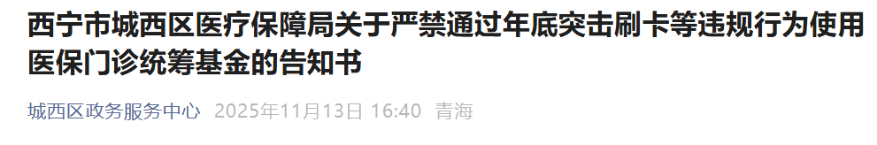 11月11日,西宁市城西区医疗保障局向广大参保群众、各定点医药机构发布《关于严禁通过年底突击刷卡等违规行为使用医保门诊统筹基金的告知书》,要求定点医药机构严守“十二不准”,其中包括不准以“冲顶门诊统筹年度支付限额”为目的,诱导、协助参保人员违规集中刷卡;不准突击开药、超剂量开药,或诱导参保人员购买非病情必需的药品、医疗器械等等。