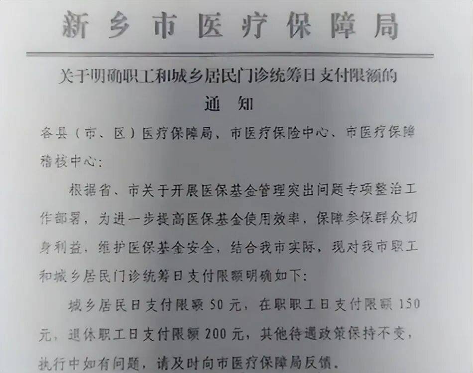 华商报大风新闻记者了解到,6月13日,新乡市医疗保障局曾发布《关于明确职工和城乡居民门诊统筹日支付限额的通知》,其中提出,根据省、市关于开展医保基金管理突出问题专项整治工作部署,为进一步提高医保基金使用效率,保障参保群众切身利益,维护医保基金安全,要求城乡居民门诊统筹日支付限额50元,在职职工日支付限额150元,退休职工日支付限额200元,其他待遇政策保持不变。