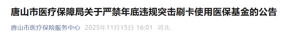 比如,11月15日,唐山市医疗保障局发布《关于严禁年底违规突击刷卡使用医保基金的公告》,要求定点医药机构不得向参保人员散布错误待遇信息,严禁诱导参保人员不合理就医购药;不得为“清空”门特(门诊特殊疾病)和门统(门诊统筹)额度而开具不必要的处方或违规售药。