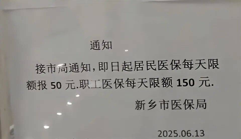 此前据大风新闻报道,近日,有河南新乡网友在当地一医院就诊时发现,院内贴出一则通知称:“接市局通知,即日起居民医保每天限额报50元,职工医保每天限额150元。”该通知落款为新乡市医保局,时间为2025年6月13日。此事引发网友关注。