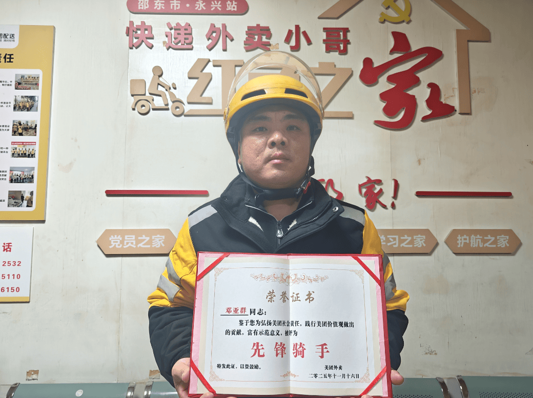 潇湘晨报记者了解到,在获悉骑手的相关事迹后,美团立即启动见义勇为专项奖励,授予邓亚群“先锋骑手”荣誉称号,并为其发放奖金5000元及锦旗、证书等,以鼓励其见义勇为的行为。