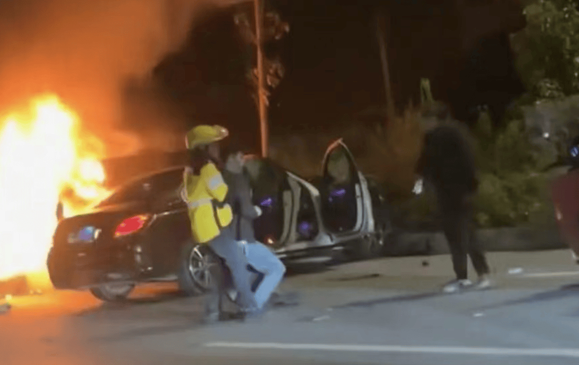 现场视频显示,一名外卖骑手将受伤人员搬到安全地带,旁边的车辆已燃起大火,冒着浓烟。