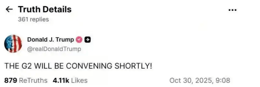 确实,很多网友都注意到,釜山中美元首会晤前,特朗普又提到了“G2”(两国集团)这个概念。他在个人社交媒体上写道:“G2即将召开!”回到美国后,他又多次提及这一概念。不少中国网民调侃,特朗普的言论堪称现代版的“天下英雄,唯使君与操耳”。
