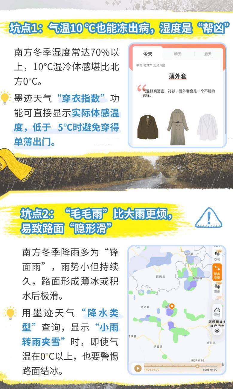 长江流域、华南等南方地区的“湿冷+阴雨”连环套,成为指南关注的重点。墨迹天气“穿衣指数”功能可直接显示体感温度,当10℃湿冷环境体感降至5℃以下时,需避免穿着单薄。针对“毛毛雨”导致的路面湿滑,墨迹天气“降水类型”查询功能可提前预警“小雨转雨夹雪”,即使气温在0℃以上,也需警惕路面薄冰。