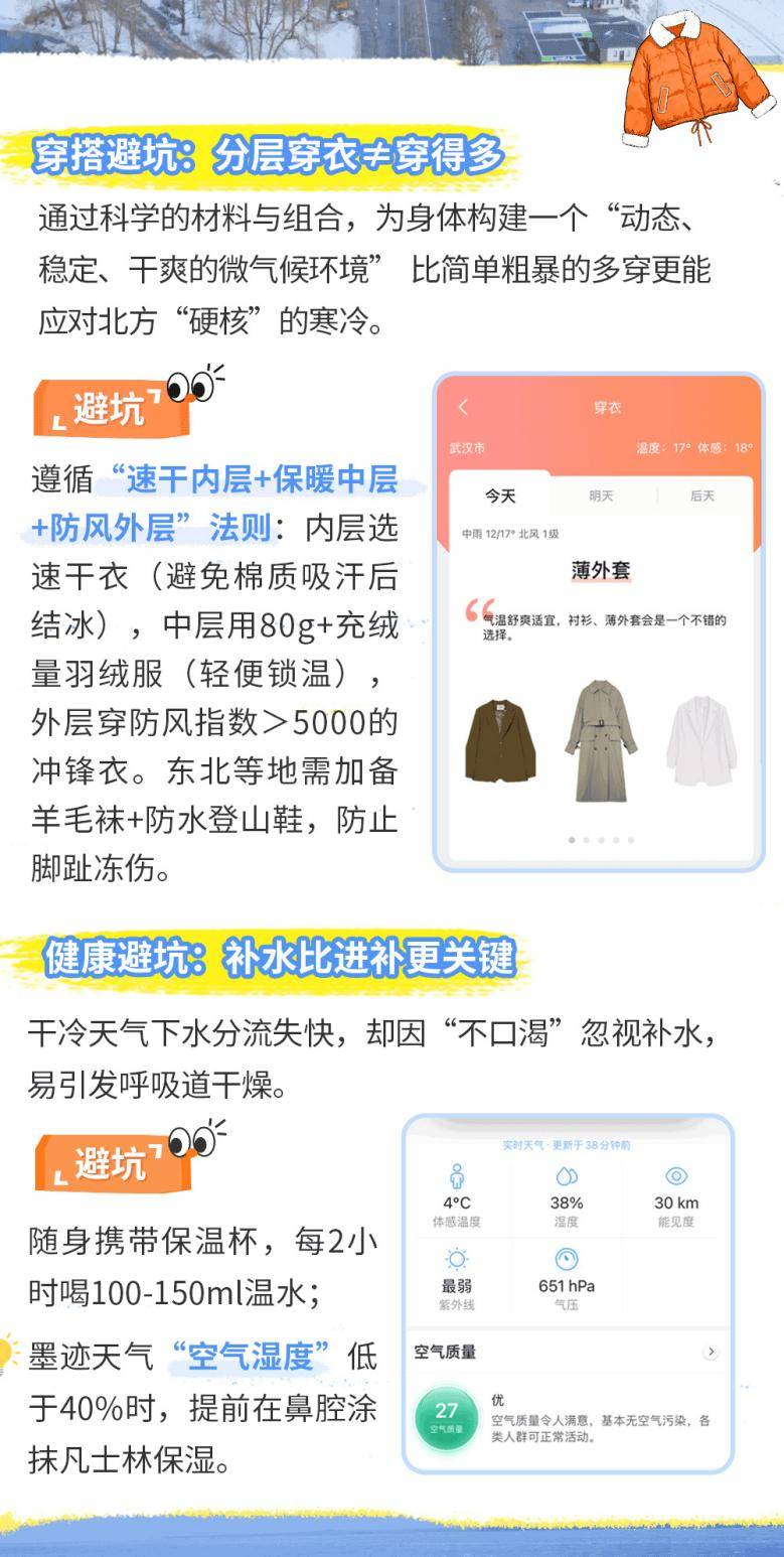 墨迹天气气象专家指出,北方“晴冷”天气中,即便阳光明媚,-15℃气温搭配5级风也可使体感温度骤降至-25℃,风寒效应不容忽视;而南方10℃湿冷环境下,因湿度常超70%,体感堪比北方0℃,持续“毛毛雨”更易形成路面“隐形滑”。指南针对此类地域性气候痛点,提出系统化应对策略。