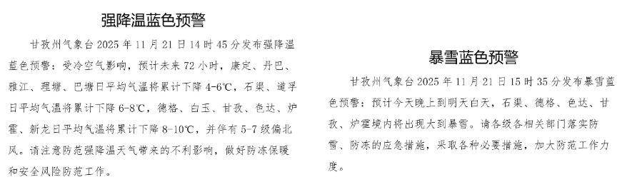 首先,11月21日下午,甘孜州气象台接连发布了强降温蓝色预警和暴雪蓝色预警。