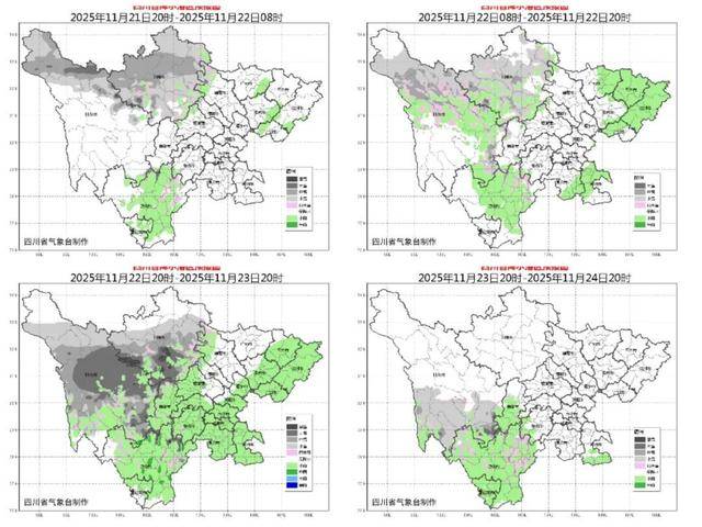 四川省气象台预计,11月22日至24日,川西高原和攀西地区有一次明显降温降水天气过程,川西高原日平均气温累计下降5—10℃,大部有阵雪(雨),局部中到大雪;攀西地区有阵雨,高海拔地区有雨夹雪或小雪。