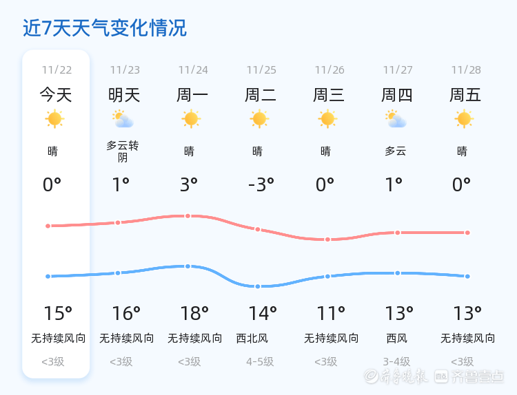 未来三天,德州天气将以晴到多云为主,气温逐渐回升,最高气温将达到18℃,最低气温维持在0℃左右。特别提醒市民,下周二(11月25日)将出现西北风4-5级,风力较大,出行时需注意防范大风带来的影响,如减少外出或妥善安置室外物品。