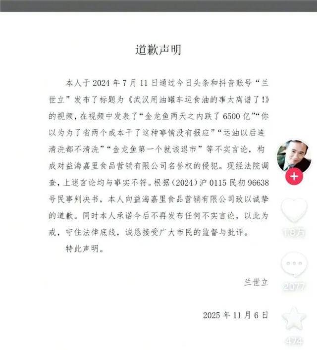 11月11日,兰世立在其抖音账号中发布了一则道歉声明,称因其于2024年7月11日发布的有关油罐车运食用油事件中针对著名品牌金龙鱼的不实言论,遵照相关生效民事判决向益海嘉里公司道歉。