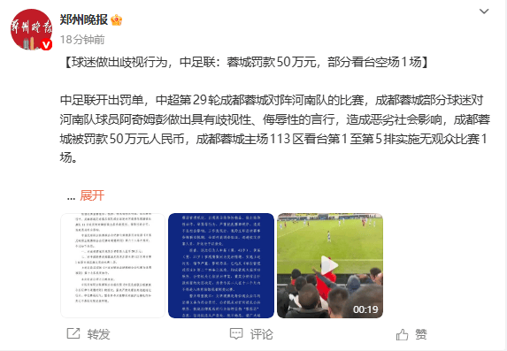 中足联开出罚单,中超第29轮成都蓉城对阵河南队的比赛,成都蓉城部分球迷对河南队球员阿奇姆彭做出具有歧视性、侮辱性的言行,造成恶劣社会影响,成都蓉城被罚款50万元人民币,成都蓉城主场113区看台第1至第5排实施无观众比赛1场。