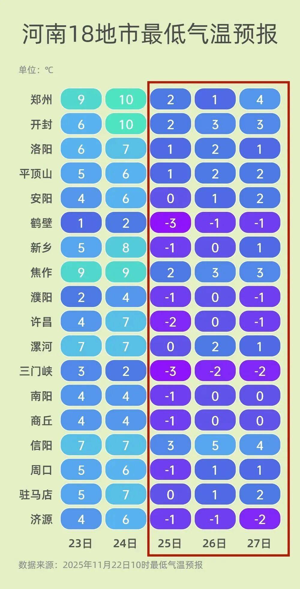 最高气温虽然起伏,但是整体都在10℃以上,早晚才是“冻”感十足!25日早晨降温最为明显,预计全省大部最低气温较前期下降6到8℃,中西部局部降幅10℃,大部地区普遍在冰点上下。早晚气温低,保暖工作是重中之重。