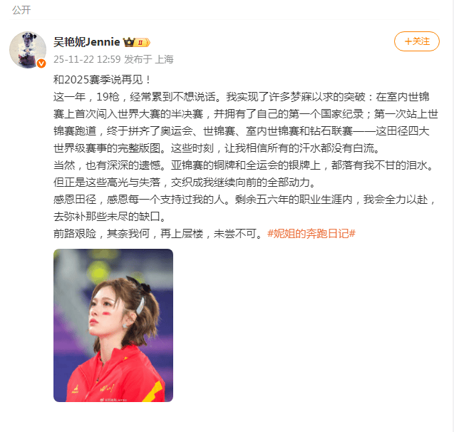 感恩田径,感恩每一个支持过我的人。剩余五六年的职业生涯内,我会全力以赴,去弥补那些未尽的缺口。