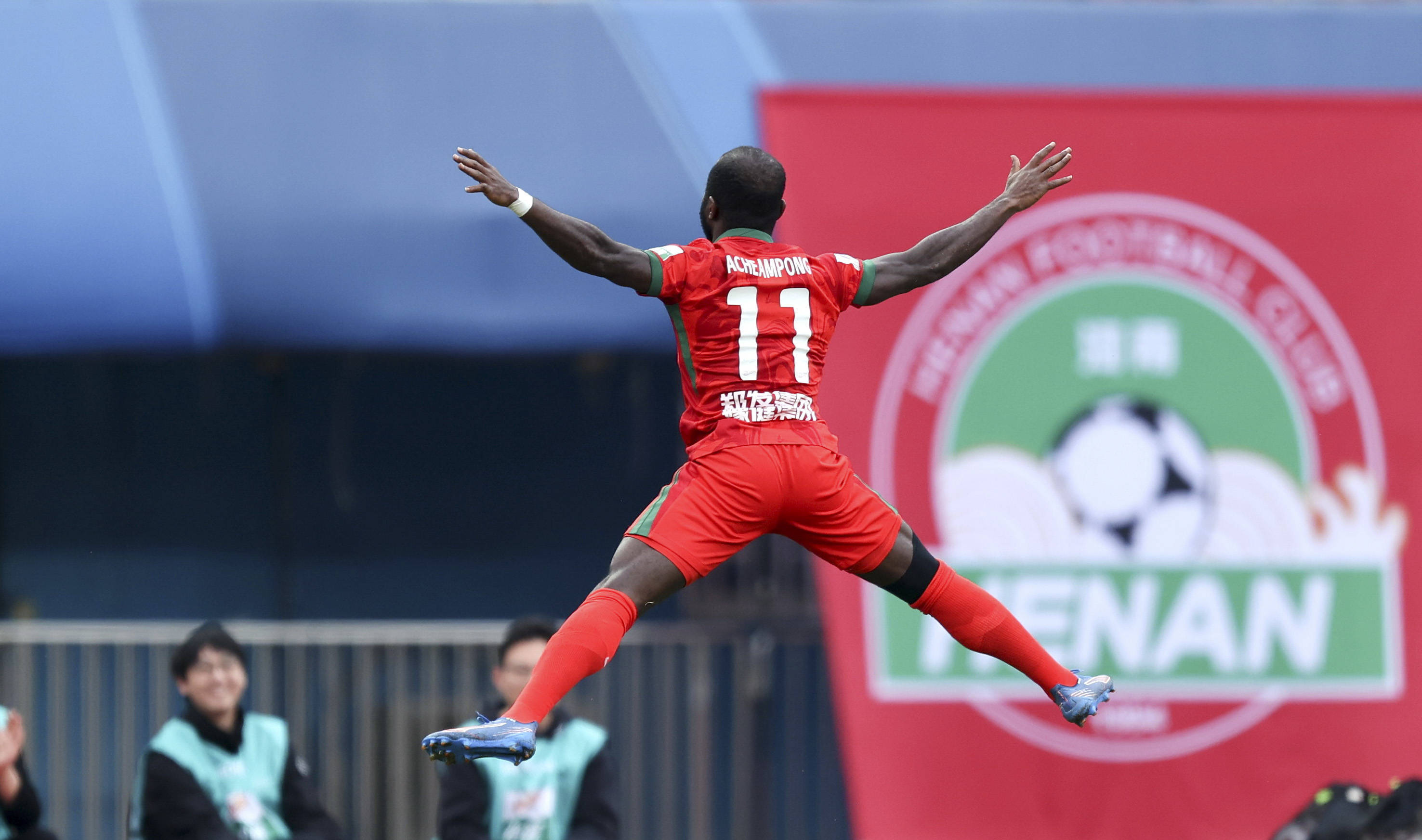 11月22日,河南足球俱乐部酒祖杜康队球员阿奇姆彭在比赛中庆祝进球。 新华社发(袁晓强摄)