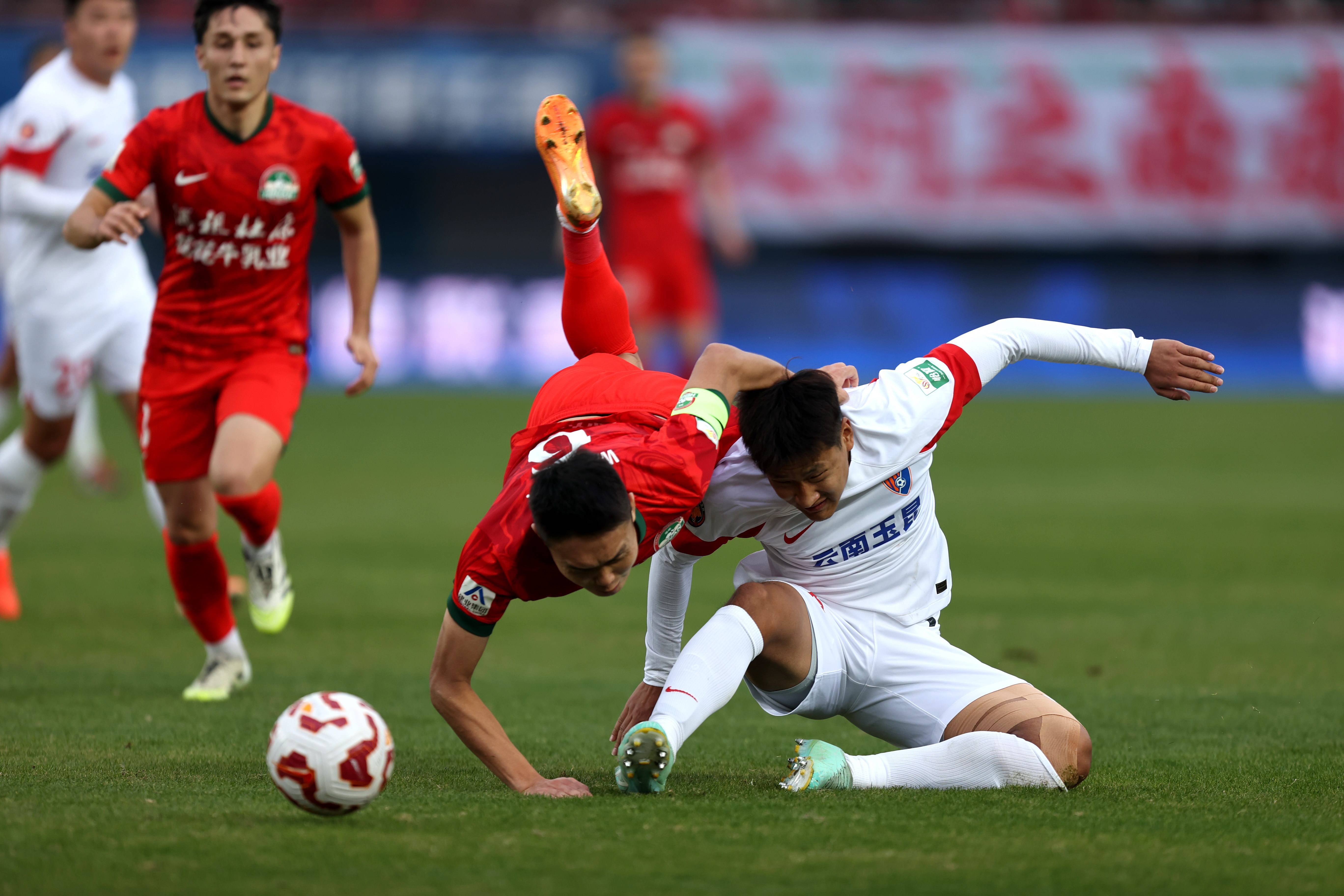 11月22日,河南足球俱乐部酒祖杜康队球员王上源(前左)与云南玉昆队球员张宸梁(前右)在比赛中拼抢。 新华社发(袁晓强摄)