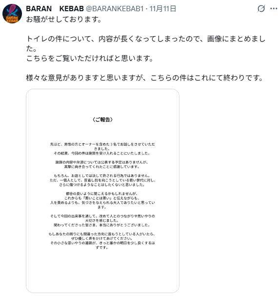 到了11 月 11 日晚上,男子来到店里,和店主一起进行了谈话,最后店家决定接受他们两人的道歉。并在X 上再次发文表示,虽然这种行为作为店家绝对不能原谅,但作为一个普通人,他不愿意继续伤害已经反省、知错就改的年轻人。这件事到此为止,不再继续公开讨论。