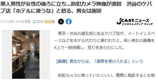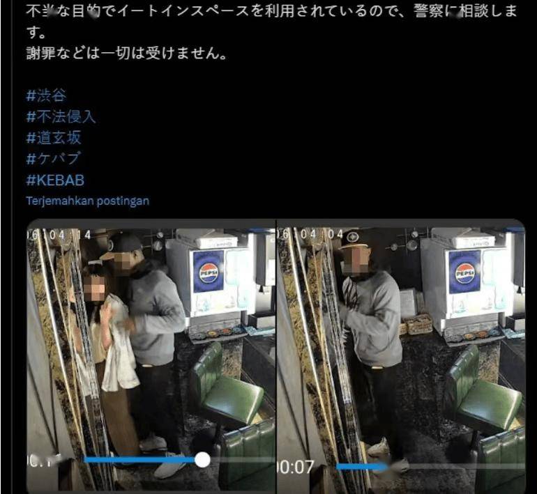 烤肉店的店主非常生气,于是在X 上发了帖子,还附上了监控画面。他们在帖子里写得很直白,说“本店的就餐区和厕所不是酒店。如果想进行性行为,请去酒店。本店设施遭到不当使用,因此将向警方咨询。不接受任何道歉”,还加上了“不法侵入”的标签。