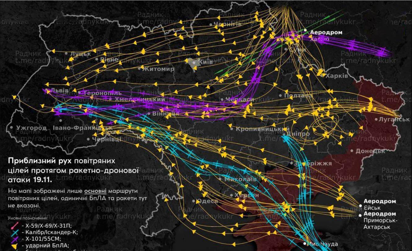 按照俄罗斯方面通报,当地时间2025年11月19日早上开始,俄罗斯军队对乌克兰西部地区的能源基础设施,军工厂,化工厂,发动了新一轮大规模导弹与自杀式无人机轰炸,不同于乌克兰总统泽连斯基的说法,俄罗斯方面表示,俄军打出了62枚导弹,包括了俄罗斯空天军图-95MS战略轰炸机发射的48枚Kh-101巡航导弹、俄罗斯海军黑海舰队护卫舰发射的10枚“口径”巡航导弹、俄罗斯空天军图-22M3战略轰炸机3枚Kh-22巡航导弹,俄罗斯陆军发射了1枚“伊斯坎德尔-M”弹道导弹,同时伴随有数百架自杀式无人机。