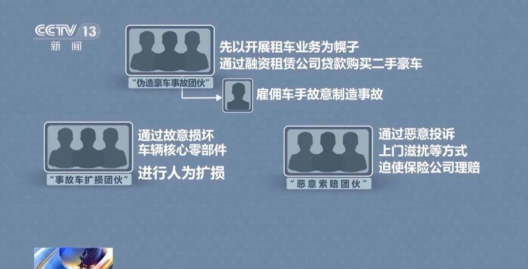 其中,“伪造豪车事故团伙”先以开展租车业务为幌子,通过融资租赁公司贷款购买二手豪车,此后雇佣车手故意制造事故;事故发生后,“事故车扩损团伙”通过故意损坏车辆核心零部件进行人为扩损;“恶意索赔团伙”则通过恶意投诉、上门滋扰等方式迫使保险公司理赔。理赔金到账后,各团伙成员再按照事先约定比例进行瓜分。