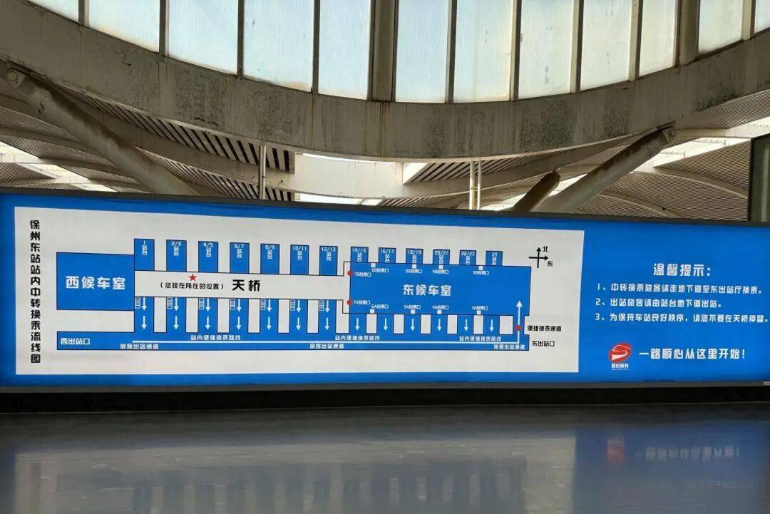 记者查询发现,徐州东站设“便捷换乘”通道,但无法直接从站台通过电梯或步梯直接上至候车室,而是需要根据指引沿着出站通道行走一段距离,快到东进站口处再上电梯进入候车室。