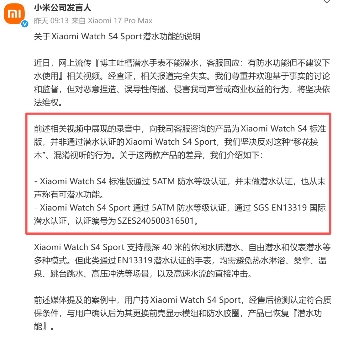 首先网络传播视频中存在“移花接木”的行为。前者咨询的是标准版,并非是专业潜水版。被人恶意剪辑传播后,直接套到了小米潜水手表头上。