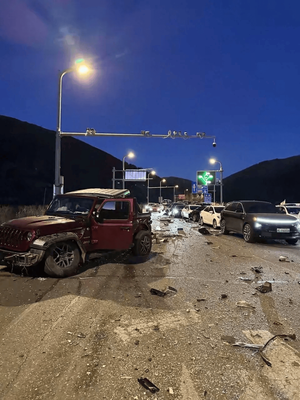 事发后,不少现场的市民拍下视频上传网络。现场视频中,约十余辆车受到不同程度损坏。其中一辆红色SUV车身损坏严重;还有一辆白色轿车车架结构被挤压,车内前后座均有乘客。