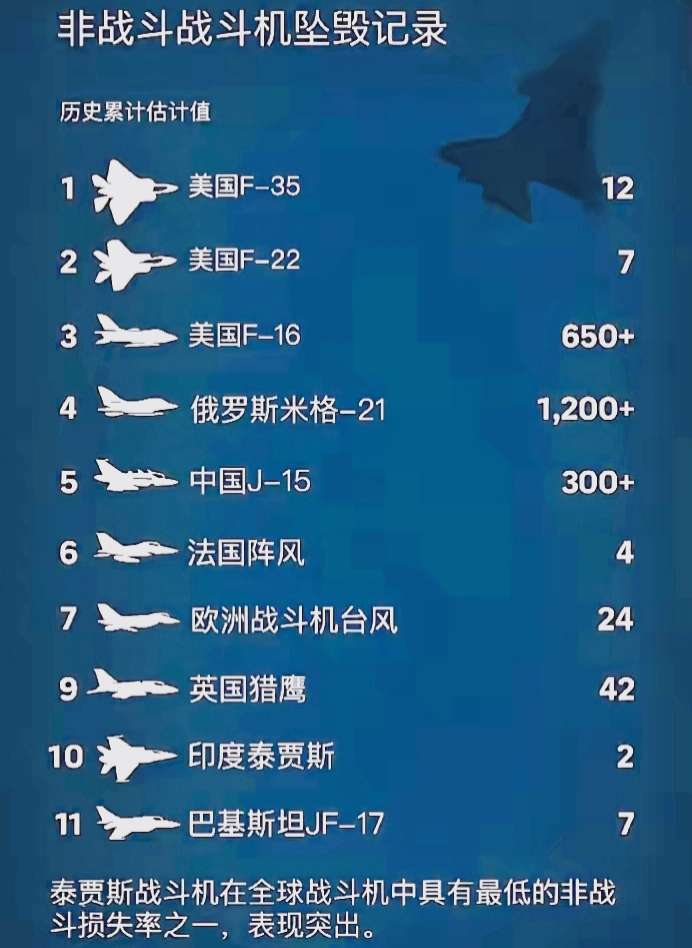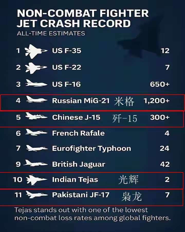 2025年11月的迪拜航展,本应是全球航空工业交流的舞台,却因印度“光辉”战机的坠毁与后续荒诞操作,沦为一场暴露军工短板的闹剧。当“光辉”战机以近乎垂直的姿态砸向地面、飞行员连弹射机会都未有时,印度媒体舆论非但没有反思技术缺陷,反而抛出“全球战机非战斗坠机数量对比图”,公然伪造数据抹黑称中国歼-15已坠毁300多架。如下图:
