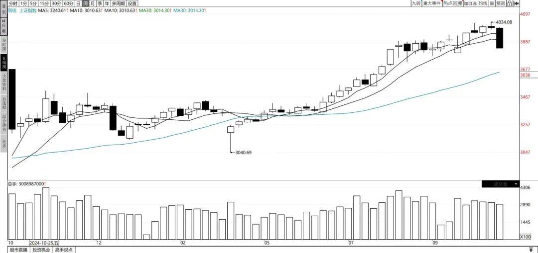 上证指数本周周K线收出一根光头光脚的大阴线,本周下跌155点,周跌幅为3.9%。