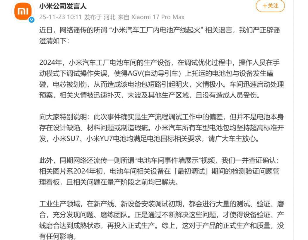 小米公司发言人11月23日发文表示,针对所谓“小米汽车工厂内电池产线起火”相关谣言,严正澄清: